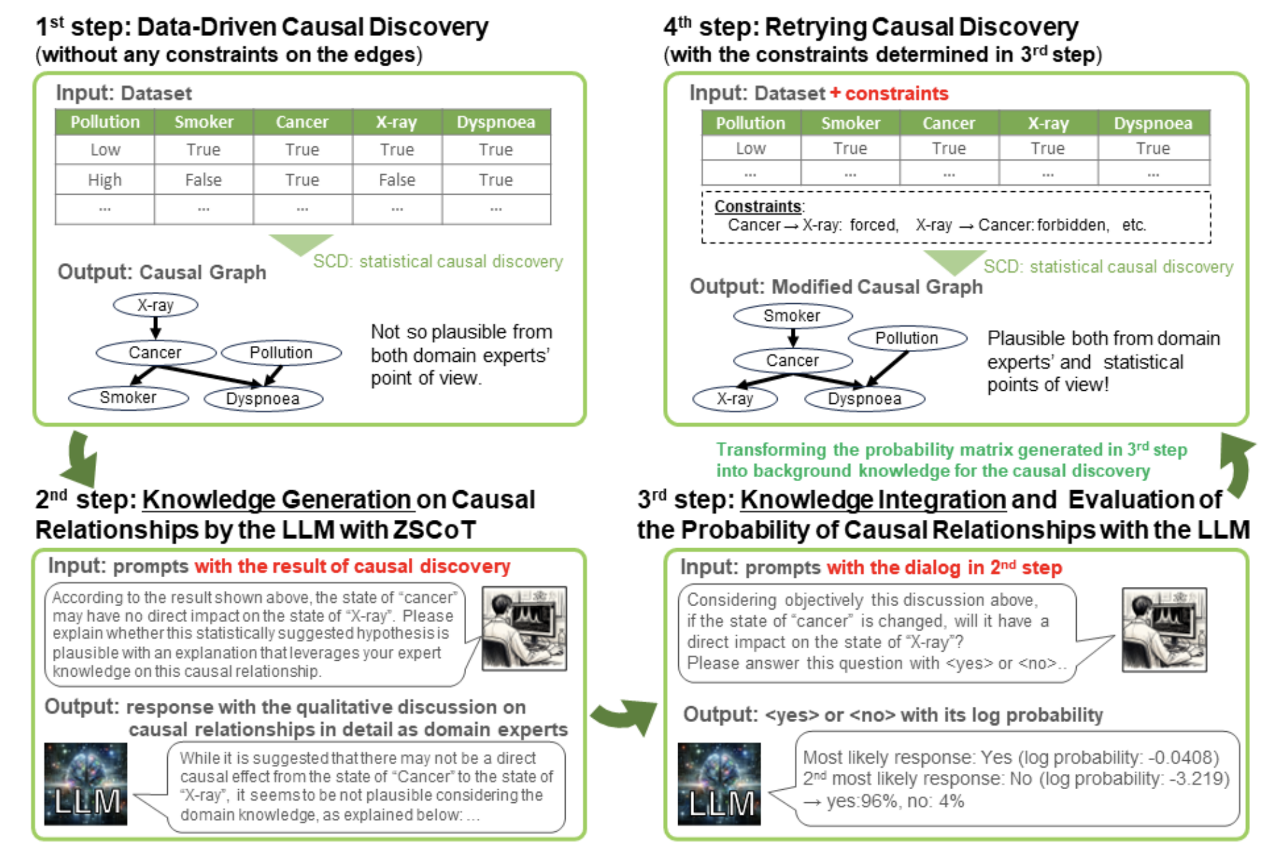 SCDの結果をLLMに渡すことで、LLMは統計情報を踏まえた判断ができます。逆に、LLMの知識をSCDに戻すことで、因果構造が現実の直感に合致しやすいものになります。