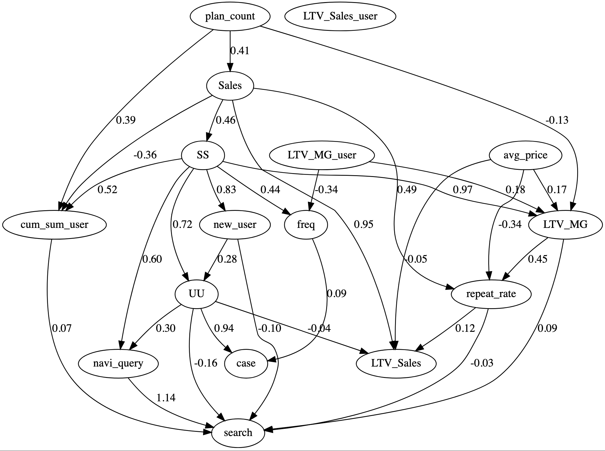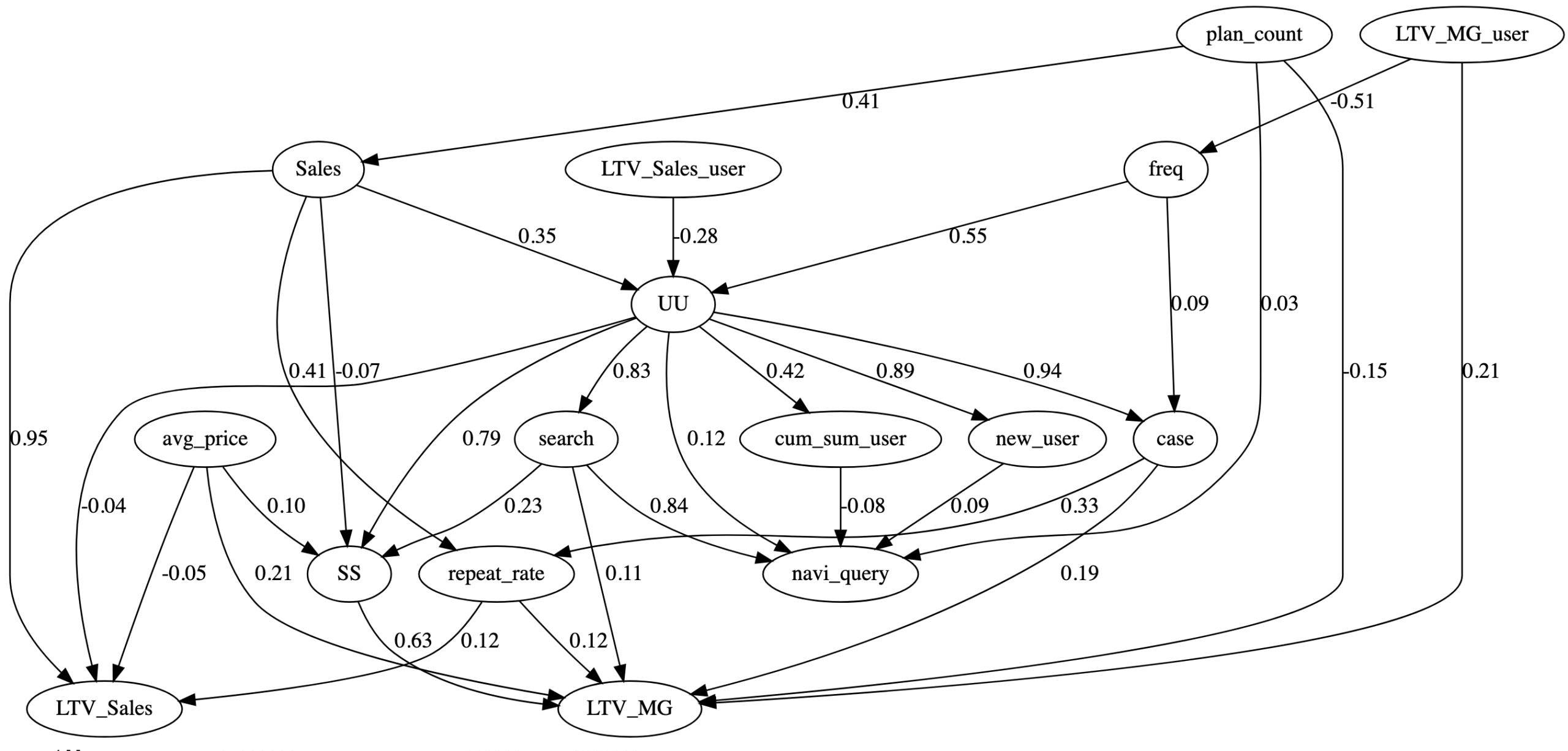 グラフからは、UU(サイトのユニークユーザー数)が主な起点となり、navi_query(ナビゲーションクエリ)やLTV_MG(利益ベース合計顧客生涯価値)、LTV_Sales(売上ベース合計顧客生涯価値)に因果が流れていく図になっています。