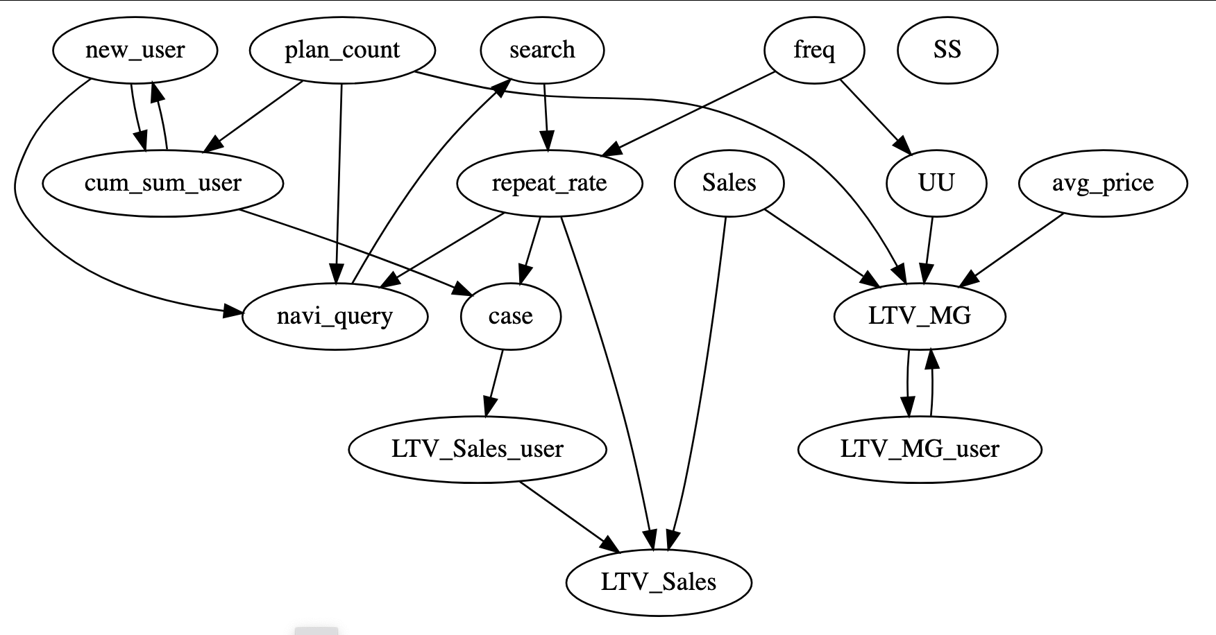 例えばnew_userとcum_sum_userにはどちらの変数からも他方にエッジが存在し、因果がループしてしまいます。同様に、LTV_MGとLTV_MG_userの間、navi_query → search→ repeat_rate → navi_queryの3変数間でも循環が発生しています。