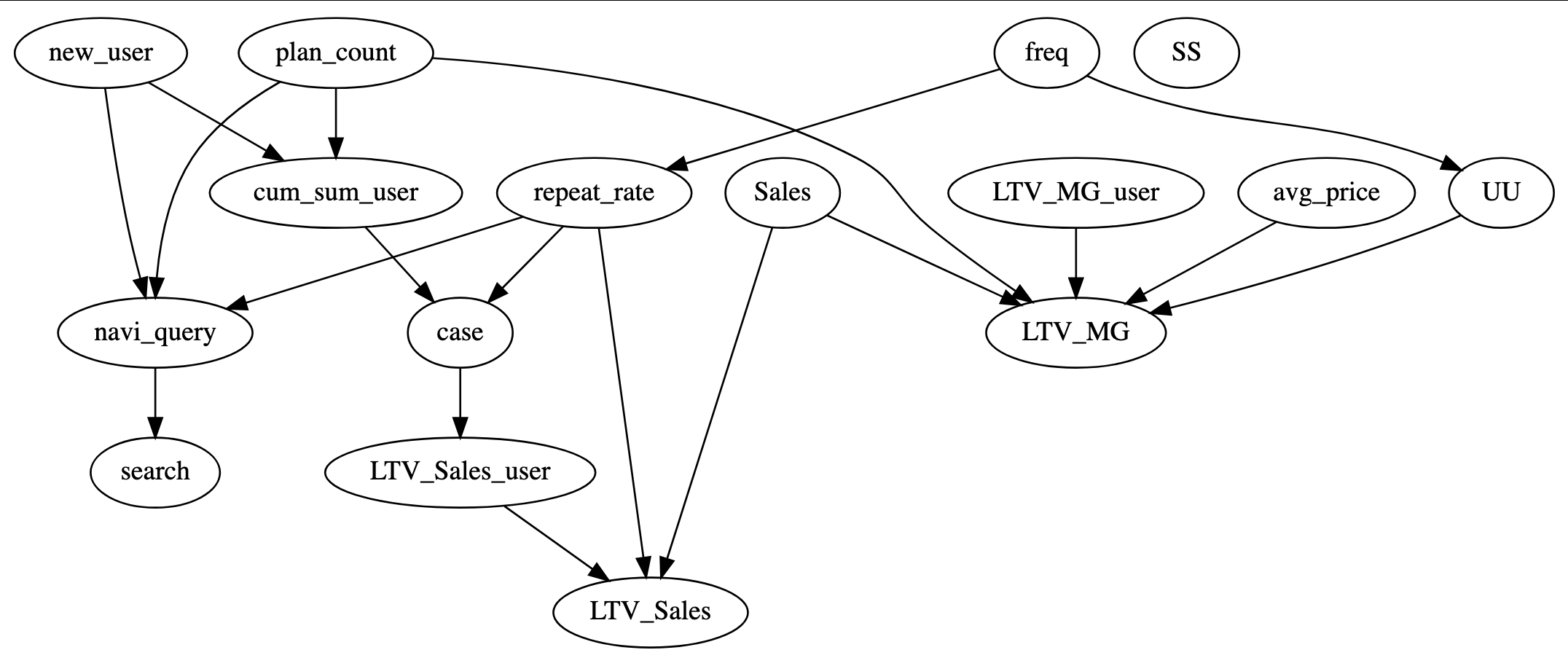 Step1ではUU(ユニークユーザー)がハブとなりnavi_query、LTV_MG、LTV_Salesへという流れになっていましたが、Step4では、plan_countやSalesを経てSS(サイトセッション)がハブとなり、search、LTV_Salesに至る構造になりました。